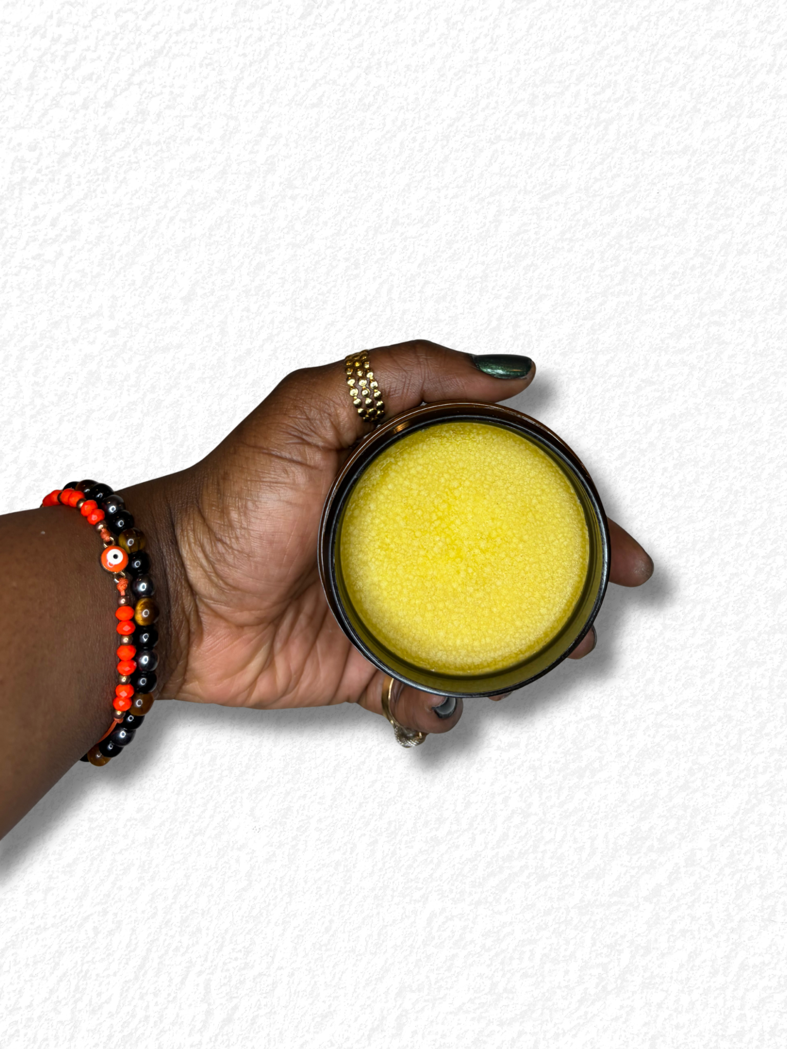 Huile de roquette, huile de moutarde, huile de carapate, huile de nigelle, macérât d’avocat (poivre noir, café, neem, romarin, poudres indiennes), huile d’akpi, huile de fenugrec, huile de jasmin, huile d’amande douce, beurre de karité, beurre de cacao, cire d’abeille, vitamines A & E.