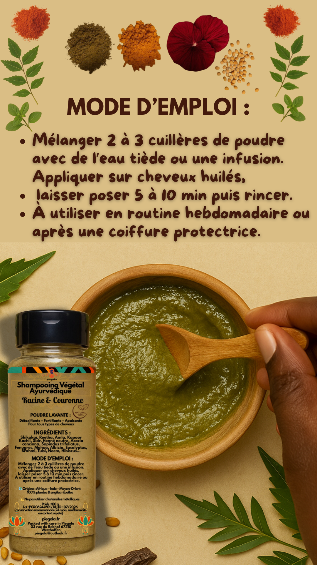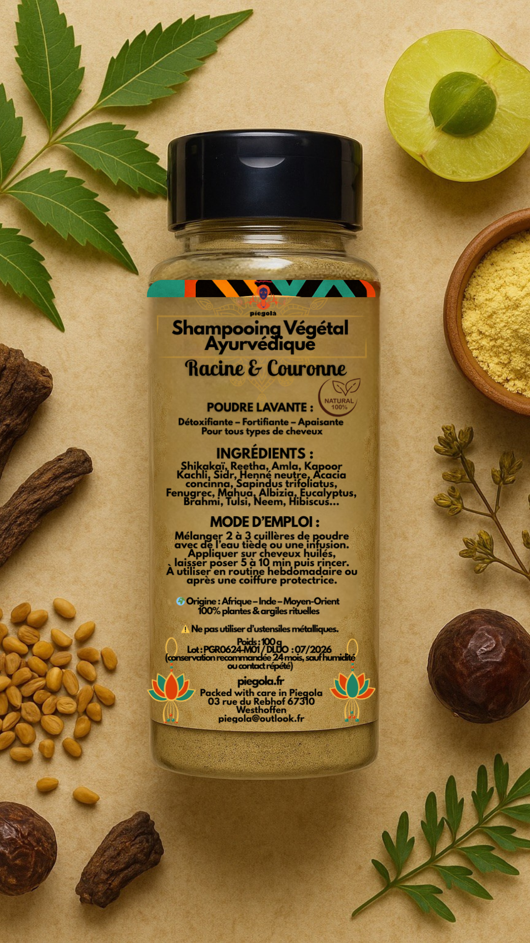 - Shampoing végétal ayurvédique (100 g) – nettoie en douceur, purifie et renforce la fibre.
