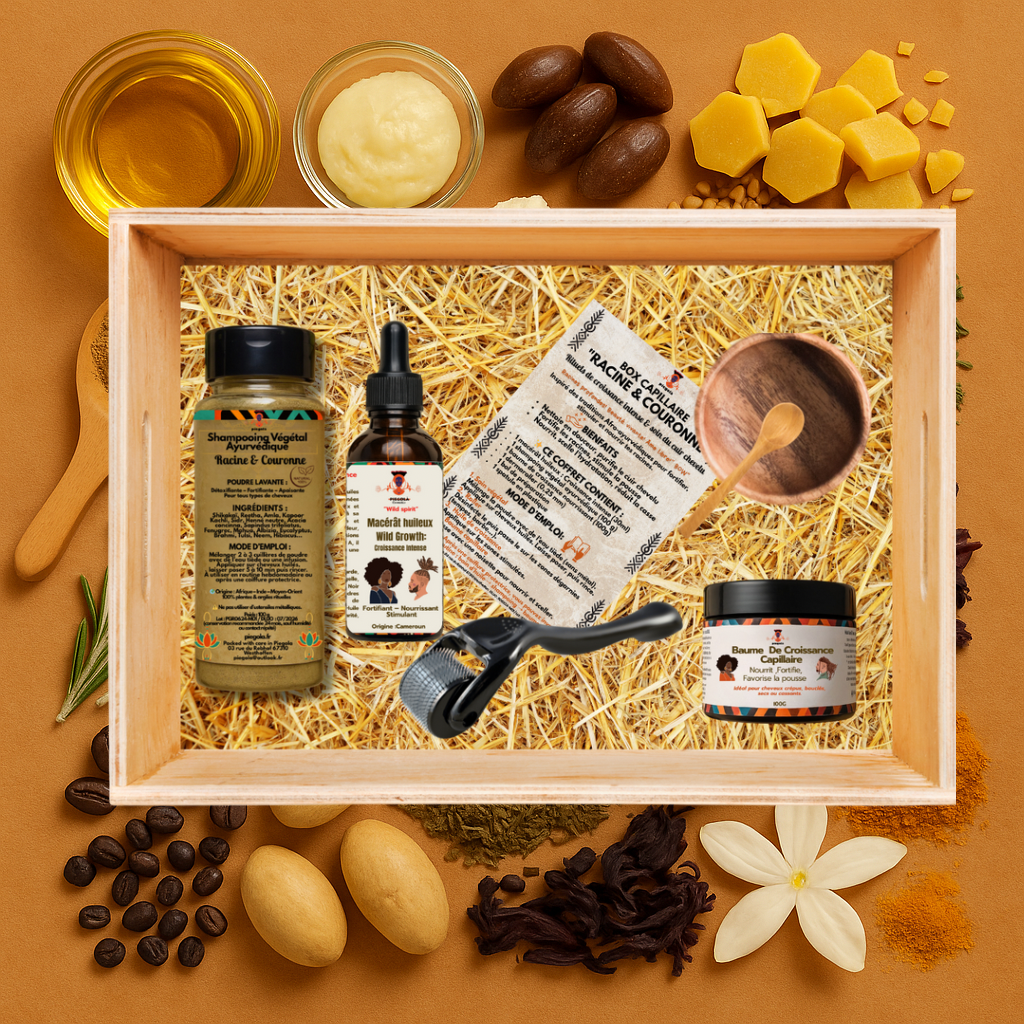 Un coffret complet inspiré des savoirs traditionnels africains, conçu pour stimuler la croissance capillaire, renforcer les racines et protéger les longueurs.